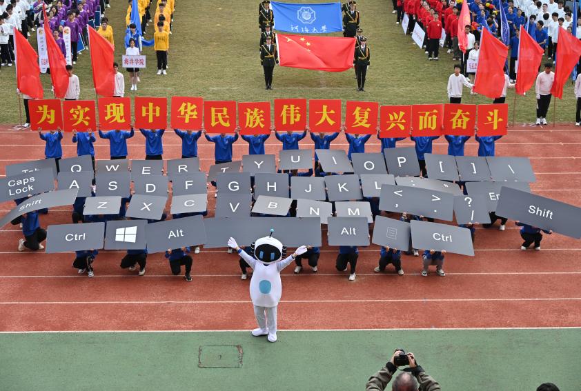 随着向主席台的靠近,智能学子一齐举起手中的“Shift”,“Ctrl”,汇聚成一个完整的大键盘,后方的同学高举的大字形成“为实现中华民族伟大复兴而奋斗”的红色条幅,前面身着机器人服装的同学向主席台挥手互动,整个方阵寓意着智能院的学子们期待在人工智能的浩瀚星空中绽放光芒,凭借自己的专业能力为实现中华民族伟大复兴贡献自己的力量。