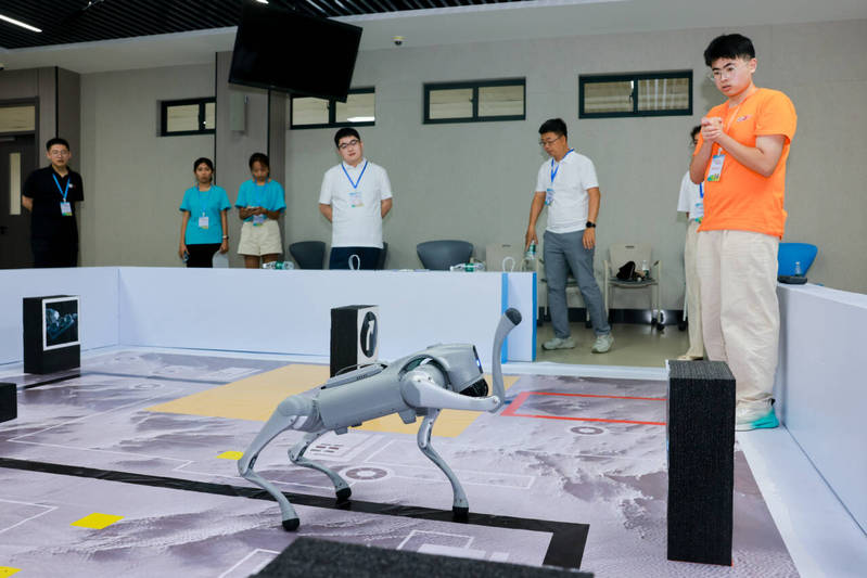 在“基于文心大模型的智能四足机器狗月球巡检系统开发”赛题中,由张卓、史朋飞等老师指导的三支队伍表现突出,共摘得国家一等奖1项、国家二等奖2项。荣获一等奖的“Its MyGO!!!”团队由2023级智能科学与技术专业王柯楠、自动化专业杨静怡、人工智能专业张啸潼三位同学组成。该团队基于宇树Go2 Edu四足平台,融合文心大模型能力,结合PaddlePaddle OCR与视觉分类模型,实现了文本识别与语义解析驱动的动态避障功能;创新采用“双源融合定位”技术,将高频里程计(50Hz)与低频SLAM位姿(1Hz)相融合,并通过“反算原点同步法”实现周期性校准,最终将终点定位误差控制在5cm以内。此外,团队借助分布式ROS2通信架构,实现了解耦运行的导航、视觉与动作控制系统,平均任务切换时间小于1秒。该系统在模拟月球复杂地形环境中实现了全流程自主巡检,展现出高精度导航与卓越鲁棒性,赛题任务完成率达到100%。